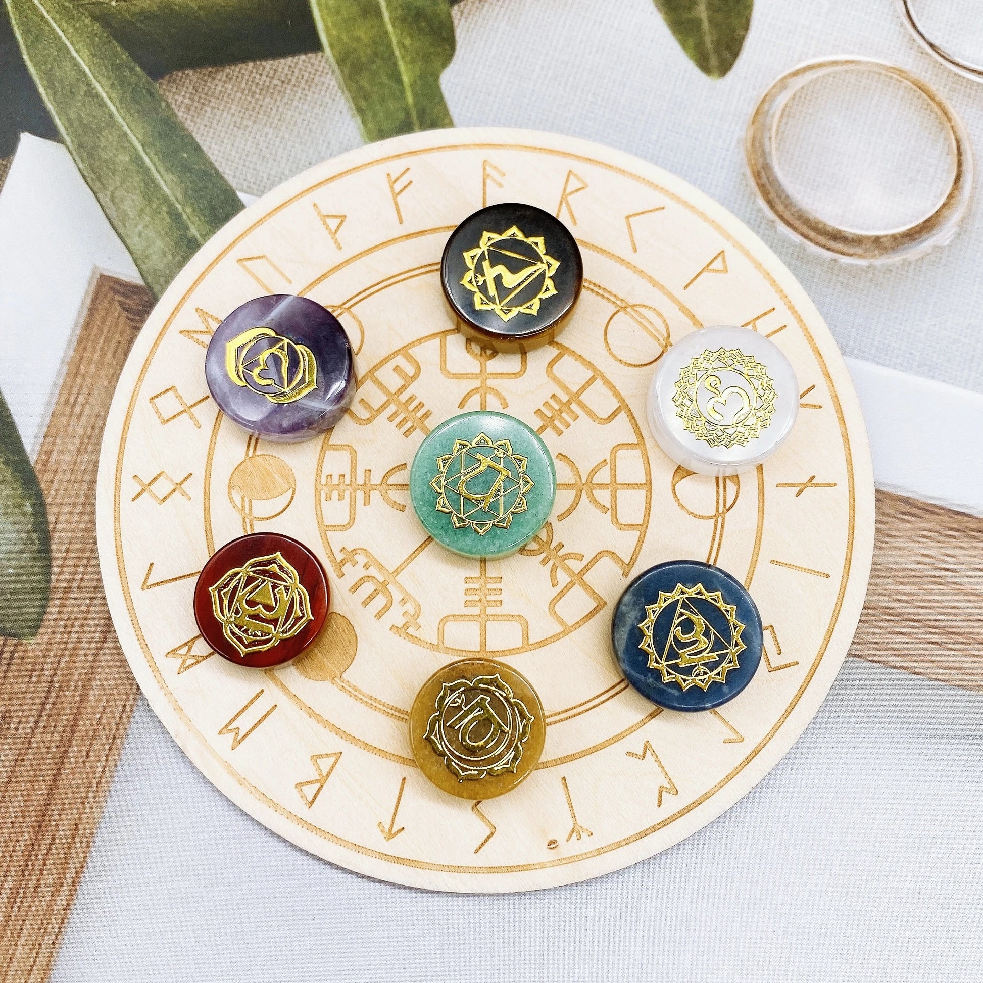 2️⃣ Place your crystals on the rune plate, allowing the symbols to amplify your energy work.